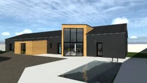 Un aménagement paysager sur l’avant vient reprendre le graphisme de la façade.